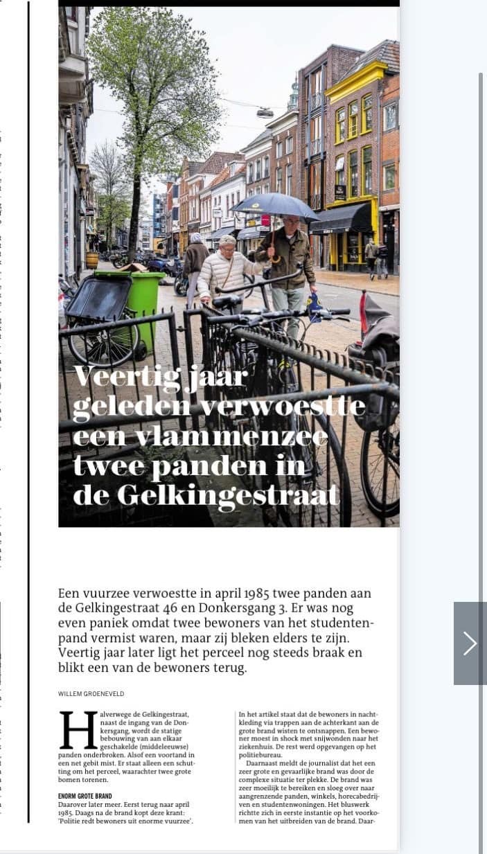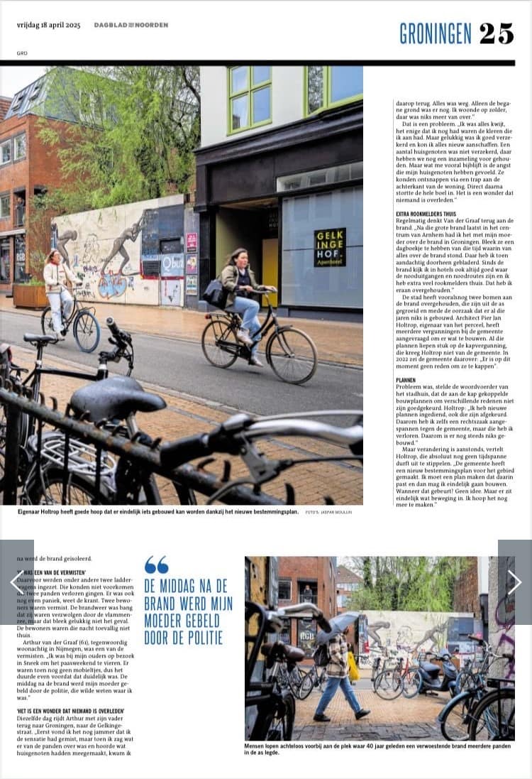 Onlangs, veertig jaar later, werd ik gebeld door een journalist van het Nieuwsblad van het Noorden- voor een kort interview over de gebeurtenissen van destijds. Het blijkt dat het gapende gat dat de brand achterliet in de binnenstad van Groningen, nog altijd niet is gevuld.